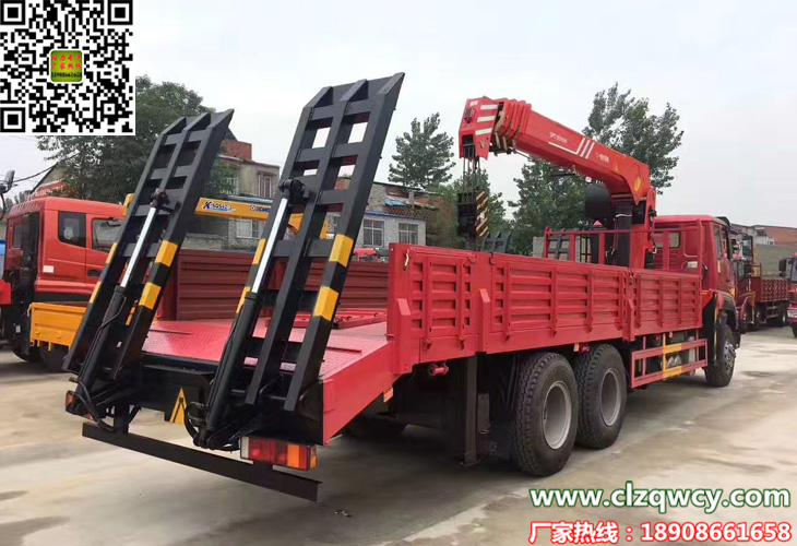 爬梯采用加强型重载设计,采用三道筋双簧加固处理,可根据需要加装液压折叠爬梯,带有后支。平板底部带有斜支撑,平板可以伸缩,伸出3米,可选择货箱栏板高度600mm,货箱栏板可拆卸,可运输大型挖掘机、大型设备等大型工程机械。还可以使用随车吊吊机吊运大件货物,一车多用。