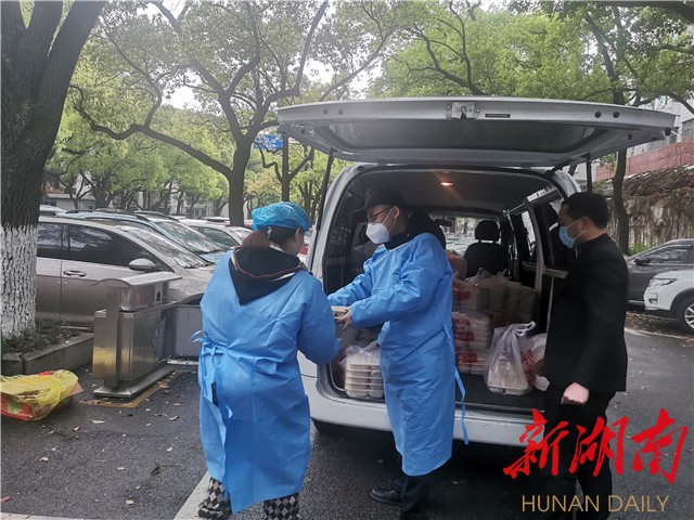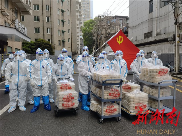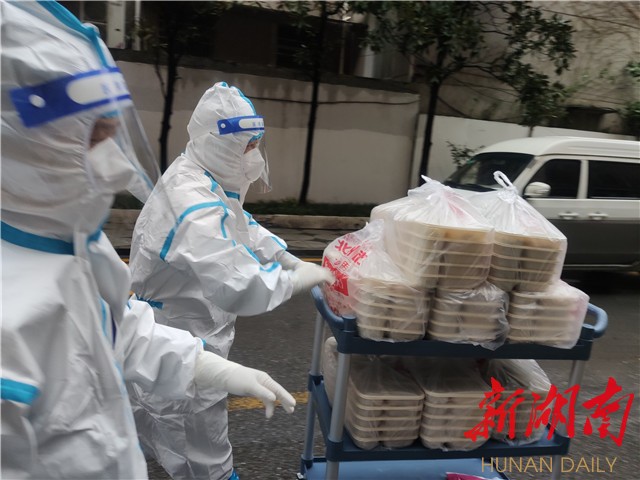 711便利店承接下单的早餐配送任务,它属于友阿集团旗下。他们每天清晨4点便起始备餐,目的是保证7点之前能够将包子以及豆浆送至封控区。家润多超市负责中晚餐,每天要预备出4000多份盒饭,盒饭做到荤素搭配,其中两荤一素是标准配置。