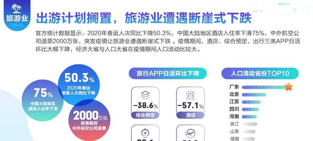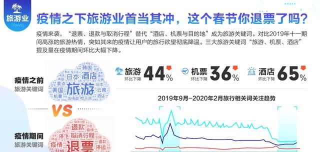 原本作为旅游旺季的春节,今年却摇身一变成了行业的寒冬时段。依据《报告》所呈现的数据表明,“酒店”这一关键词的搜索量与之前相比,环比出现了下降状况,下降幅度达到了65%。而且,酒店类别相关的APP每日活跃用户数量更是急剧下跌,跌幅高达57.1%。绝大部分的人都纷纷取消了所预订的机票以及酒店订单,旅游业近乎在一夜之间就陷入了归零的境地。