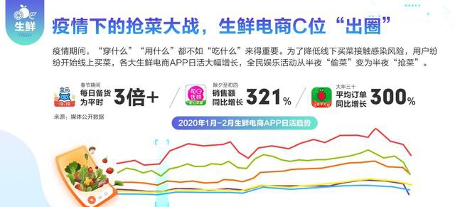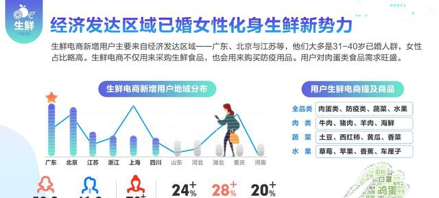 最引人注目的当中生鲜电子商务是,无法出门去购买蔬菜的状况致使,在线上进行买菜成为了必需的需求,且各个大型生鲜类手机应用程序每日活跃用户数量大幅度地增长,新增加的用户绝大多数集中于广东省、北京市、江苏省,其中大部分大部分是年龄处于31到40岁的已结婚妇女而且她们承担起了整个家庭的一日三餐供应。