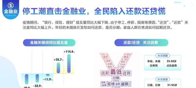 因为延期复工,致使不少人面临着“降薪”以及“裁员”的压力,这种情况直接在关键词搜索方面显现出来,其中,“还款”的提及量同比大幅飙升了114.4%,然而,“银行”以及“理财”的关注度却显著下降,这是由于大家手头都很紧张,所以暂时没办法顾及投资理财。