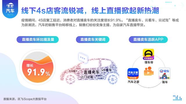 4S店没法开门营业,销售们逐个转变身份成为主播,接着直播卖车变成了新的潮流趋势。《报告》表明,“直播卖车”的受关注程度增长了91.9%,“云看车”“云试驾”这些新出现的词语开始进入到人们的视野范围。在线上看车,在线下送车,正逐渐成为一种新的销售模式格式。