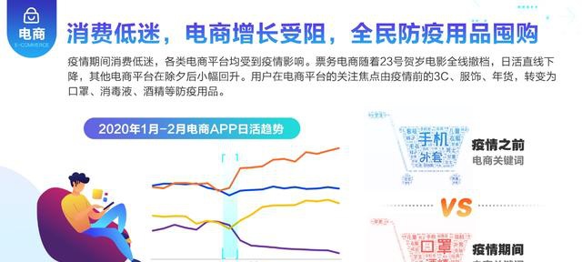 疫情致使电商平台历经一场大洗牌,票务电商因贺岁片撤档,日活急剧下滑,然而口罩、消毒液、酒精的搜索量呈爆炸式增长,消费需求由3C数码、服饰年货,快速转向防疫用品和食品。