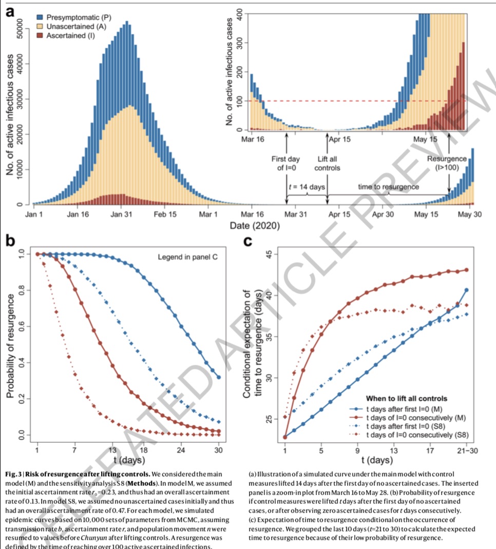 对于用模型所开展的那项带有危险性的推演进行了研究:要是在首次通报并无新增病例之后的第14天便解除全部相关限制,那么最终的结果究竟会是怎样的呢?推演得出的结果呈现出灾难性的状况,疫情出现反弹的概率高达97%,而且在解除限制之后的第34天还出现了病例的激增情况。传播源头主要是来自那些在此之前并未被发现的症状较为轻微甚或毫无症状的病例。