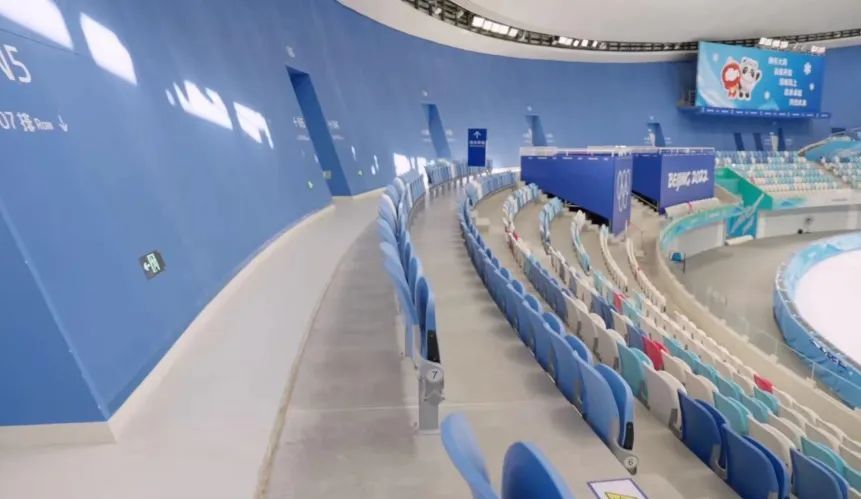 步入比赛大厅,最先映入眼帘进而最能直接产生的感觉便是“大”,那冰面面积达1.2万平方米,其大小等同于两个标准足球场,它是实实在在、当之无愧的亚洲最大冰面,站于看台上朝着下方望去,洁白且平整的冰面上搭配着颜色从乳白过渡到深蓝的座椅景致,在视觉方面自然而然地就有着自我降温的效果。