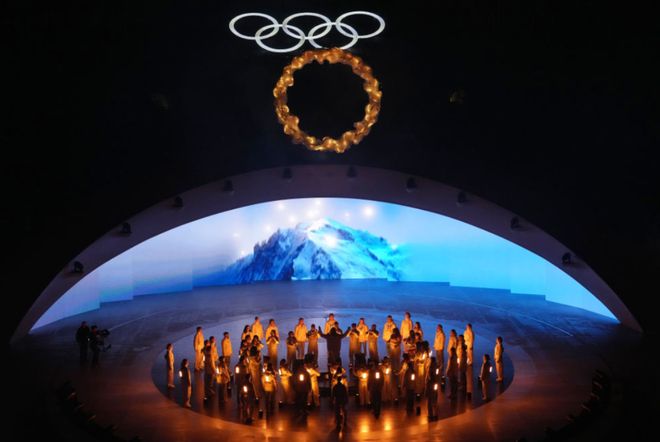 铺在舞台中央的那巨大水面,宛如一滴水珠,倒映着周边古老石墙。歌剧选段自看台传来,这是意大利人向世界呈现其引以自豪的艺术传统。运动员们不论国籍地座在一起,过去两周于雪山冰面上的激烈竞技,此时化作拥抱与合影。