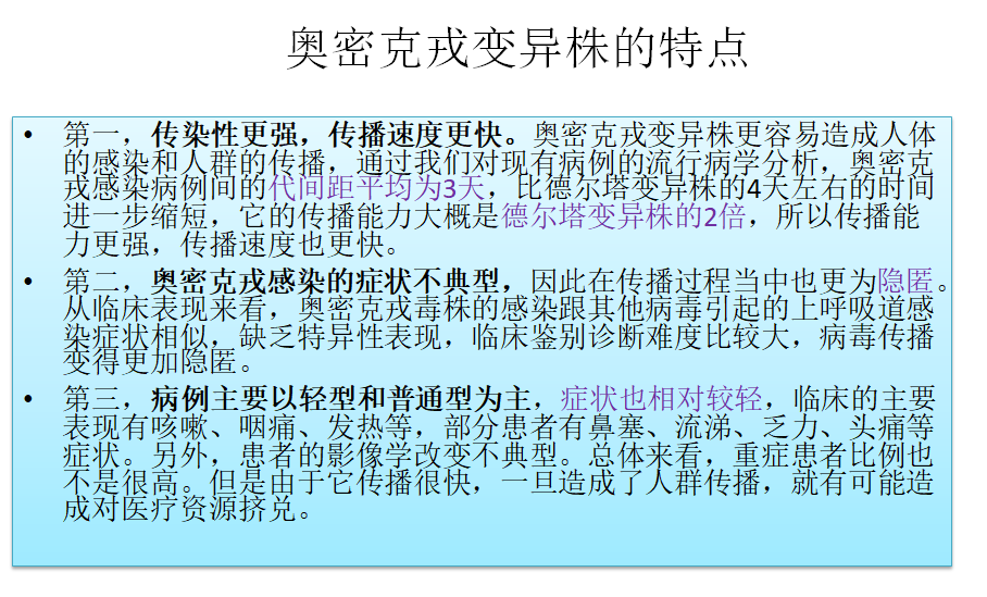 奥密克戎成了全球100多个国家的主要流行株,天津等地数据显示它自身引发的症状相对较轻,重症率大概是0.6%,然而它的传播力更强,绝不能疏忽大意。我国研究数据证明,疫苗对奥密克戎仍然有效。