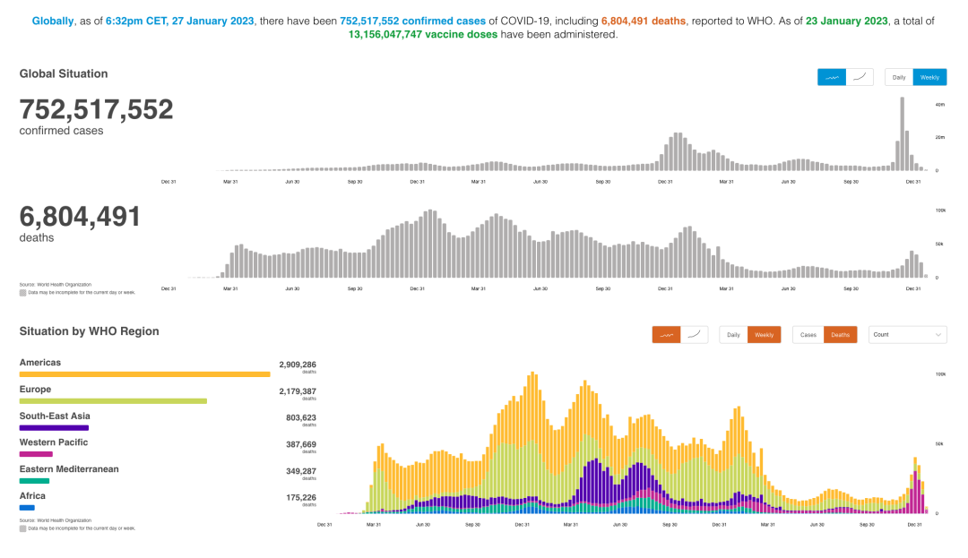 起自1月8日,中国政府把新冠病毒感染从“乙类甲管”调整成“乙类乙管”,对新冠病毒感染者不再施行隔离举措,不再去判定密切接触者,当下,世卫组织已更新相关数据页面(WHO COVID-19 Dashboard),旨在纳入中国最近几周所报告的病例以及死亡人数。