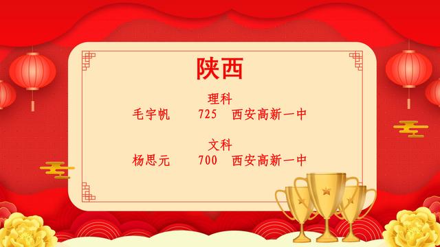 来自三明永安一中的福建理科状元罗开荣取得了711分的成绩,出自厦门双十中学的文科状元林润澜分数为668分。在西北师大附中就读的甘肃理科最高分赵西麟分数是704分,来自张掖民乐一中的文科状元扬婷婷成绩为686分。