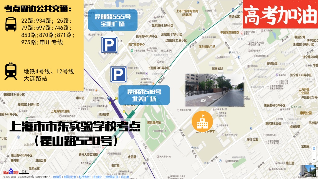 霍山路520号处于靠近大连路隧道口的位置,早高峰时段过江的车流常常拥堵至此处。乘坐公交的考生需要留意22路以及934路的发车间隔,有时候等待20分钟才会有一辆车到来。要是乘坐地铁4号或者12号线,从大连路站步行前往要经过几个红绿灯。