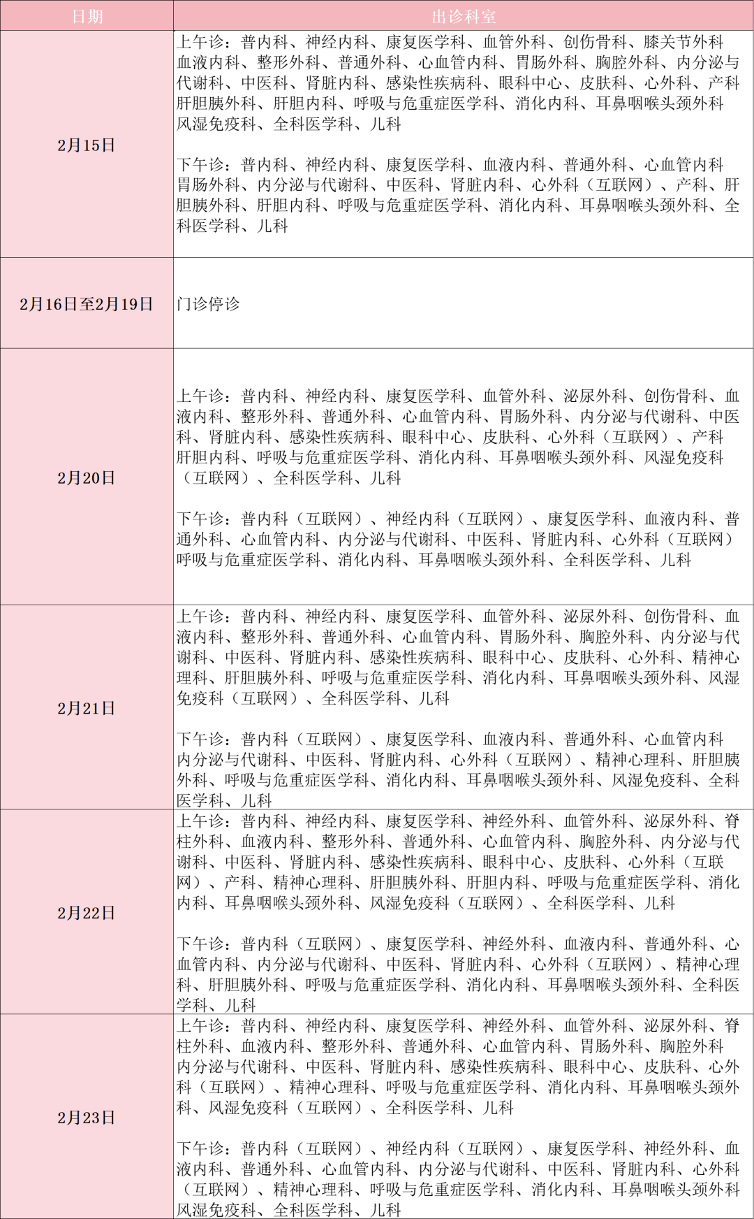 到了2月16日开始一直持续到19日 的这个时间段,门诊的安排会出现比较大的变动 ,部分医院在这段期间会完全停止门诊 ,单单只安排儿科半天的上午门诊的 ,有的在门诊安排方面是一直到也就是从2月19日开始才会去把已经一度停止的周六半日门诊恢复 ,像举例得某院区一样 ,分别在2月19日、21日、23日这样一些日子安排的是周六半日门诊的安排 ,然而于在前面提到于2月20日以及22日这两天安排的却是周日半日门诊, 所以患者是需要很仔细地去区分清楚的。