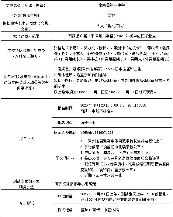 除去文化课成绩优秀突出的学生,南靖一中在2025年的时候还会进行体育特长生的招收,其具体的方案在附件里已经有着详细的阐述说明。体育特长生是需要去参加专门设置的测试的,这和文化课自主招生是属于两条不一样的通道。有体育方面特长的同学能够依据自身实际情况来选择报考。