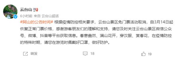 成为旅游大市的洛阳以及焦作反应最为快速,洛阳市方面,龙门石窟、老君山、鸡冠洞、白云山等十多家景区,于3月13日晚间依次发布公告,宣称免票活动提前终止。焦作市的云台山、青天河、陈家沟、影视城等7家主要景区同样取消免票,恢复平常门票价格。这些景区的工作人员连夜调节售票系统,更换园区公告牌,保证3月14日开园前达成所有调整工作,防止游客抵达现场后引发纠纷。