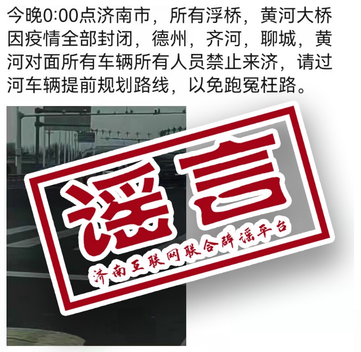 3月18日,有一条消息在抖音以及微信群里刷屏了,这条消息是“济南市所有浮桥、黄河大桥因疫情全部封闭”。当晚的时候,就有货车司机在桥头排队等候着,物流园调度电话被打爆了。济南市交通运输局连夜去核实情况,凌晨发布了辟谣通知:全市所有高速公路、国省道及浮桥全部正常通行。实际上,谣言源头仅仅是一名网友,这名网友看到检测站车辆缓行,随口编了一句“可能要封”。